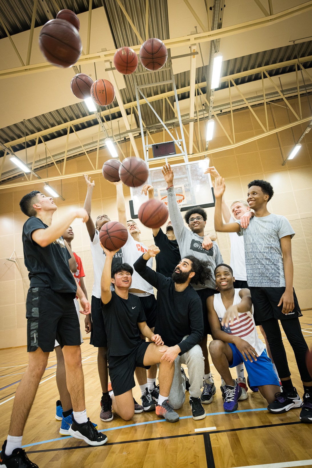 Araz och ungdomar Published 2022-03-17 at 1093 × 1639 in Araz och ungdomar ← Föregående Nästa → Araz i Sjumilahallen med ett av de gäng han tränar basket med. En grupp killar kastar upp basketbollar i luften i en baskethall.