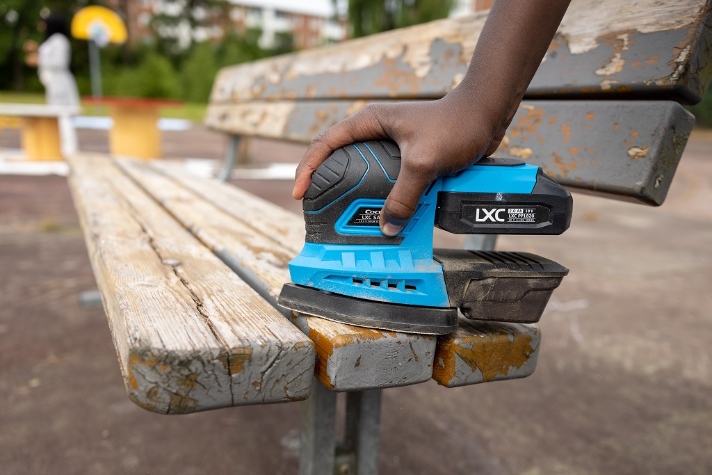 Designklubben5 Published 2022-10-05 at 1024 × 683 in Designklubben5 ← Föregående Nästa → Bänkar slipas för att sedan målas om. En hand håller i en slipmaskin och slipar en bänk.