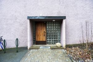 Porten till Syster Estrids gata 4 är i klassisk 50-talsstil.