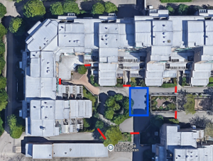 Arbetet innebär också att vissa delar av gården (se blå ruta på bilden), och därmed tillträde till entréer (se röda streck), kommer att spärras av under torsdagen den 15 maj då kranbil behövs. Detta görs av av säkerhetsskäl.