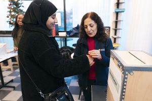 Sori, utvecklingsledare inom social hållbarhet på Bostadsbolaget, är på plats för att ta emot väljare i vallokalen.