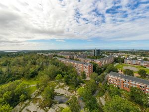 Tynnered ligger grönt och vackert och havet syns i bakgrunden. Bostadsbolagets nya hus på Briljantgatan sticker upp i mitten.