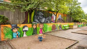 När hyresgästerna själva får välja blir det – graffiti. Den tidigare grå och tråkiga betongmuren förvandlades till ett färgsprakande konstverk efter en omröstning bland de boende på Briljantgatan. Nu kan barnen på lekplatsen intill istället glädjas åt sagomotiven, signerade Marcus Jonsson.