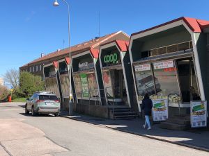 Butikslängan på Doktor Bex gata, vid ändhållplatsen för 10:ans spårvagn, måste höra till Göteborgs mest udda byggnader. Husen, som ritades av arkitekten Henning Orlando, stod färdiga 1951 och påminner om den tidens tv-apparater. Konsum flyttade in som första hyresgäst och än idag ligger det en Coop-butik här, liksom en pizzeria, frisersalong och andra verksamheter.