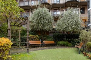 Robert Nilsson och Kajsa Söderberg har bott grannar i samma hus i nästan 25 år och stormtrivs. Först i våningarna ovanför varandra – nu vägg i vägg på bottenvåningen med var sin uteplats. De ses i stort sett dagligen. Att vi befinner oss så centralt är svårt att förstå här inne på den lummiga, lugna gården. Här finns en lekplats och ett litet jordgubbsland att plocka i för både små och stora hyresgäster.